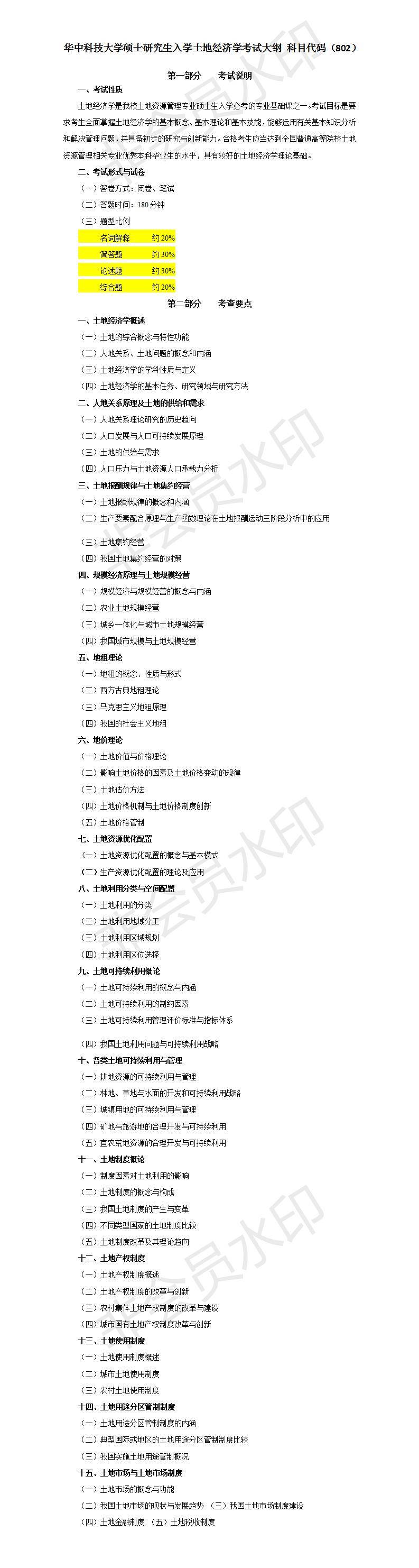 华中科技大学21年考研大纲+题型分值+重难点+参考书:802土地经济学,如下图: