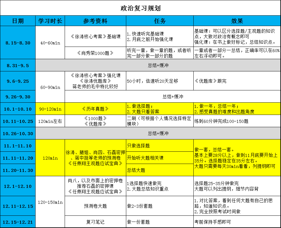 (以上仅供参考,如果专业课比较吃力、复习时间较晚的同学,可以9月中下旬开始政治,在标黄色的部分适当减少即可。但是没有充分把握的情况下,政治复习不应晚于9月底。)