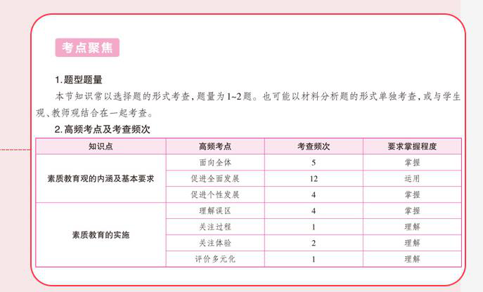 这张图是“素质教育”这个知识点的考点解读,根据图上标注我们可以知道,它一般是出选择题,也有可能在材料分析题里和其它知识点组合考查。应对选择题,我们可以根据表格里总结的考查频次和要求掌握程度来选择是否要背下来,比如下面三行只要求理解的内容就不需要记,要求掌握的几点内容也可以选择性记忆,但是要求“运用”的内容就得要背下来了,它很有可能就是出现在材料分析题里的,如果不背下来那么材料题里你就没有东西可写,而且从图中还可以看到它的考查频率是很高的,每年都在考,这种内容就要做好标记以方便后期记忆。后面的内容基本都是按照这个步骤来,可以边学边整理一个重点记忆内容集合,这样看完整本书后重点也都划出来了,可以节省点时间。当然如果有同学觉得这样比较麻烦也可以不整理,买知点学派全套资料的时候它会附赠一个重点知识点的小册子,可以背背那个,不过那个小册子很薄,相对来说要简略一些,在此基础上可以自己总结完善。