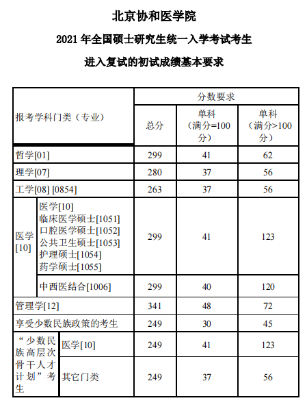 我校依照教育部公布的《2021年全国硕士研究生招生考试考生进入复试的初试成绩基本要求》(国家分数线),制定了《北京协和医学院2021年全国硕士研究生统一入学考试考生进入复试的初试成绩基本要求》(见附件)。