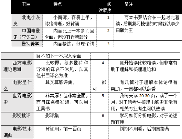除世界电影史和艺术词典外的书目都要看两遍,3月到6月除了上课我就一直在看书和看片。背书我是从8月左右开始背的,现在看来是有点晚了,可以从7月一开始就背专业课。