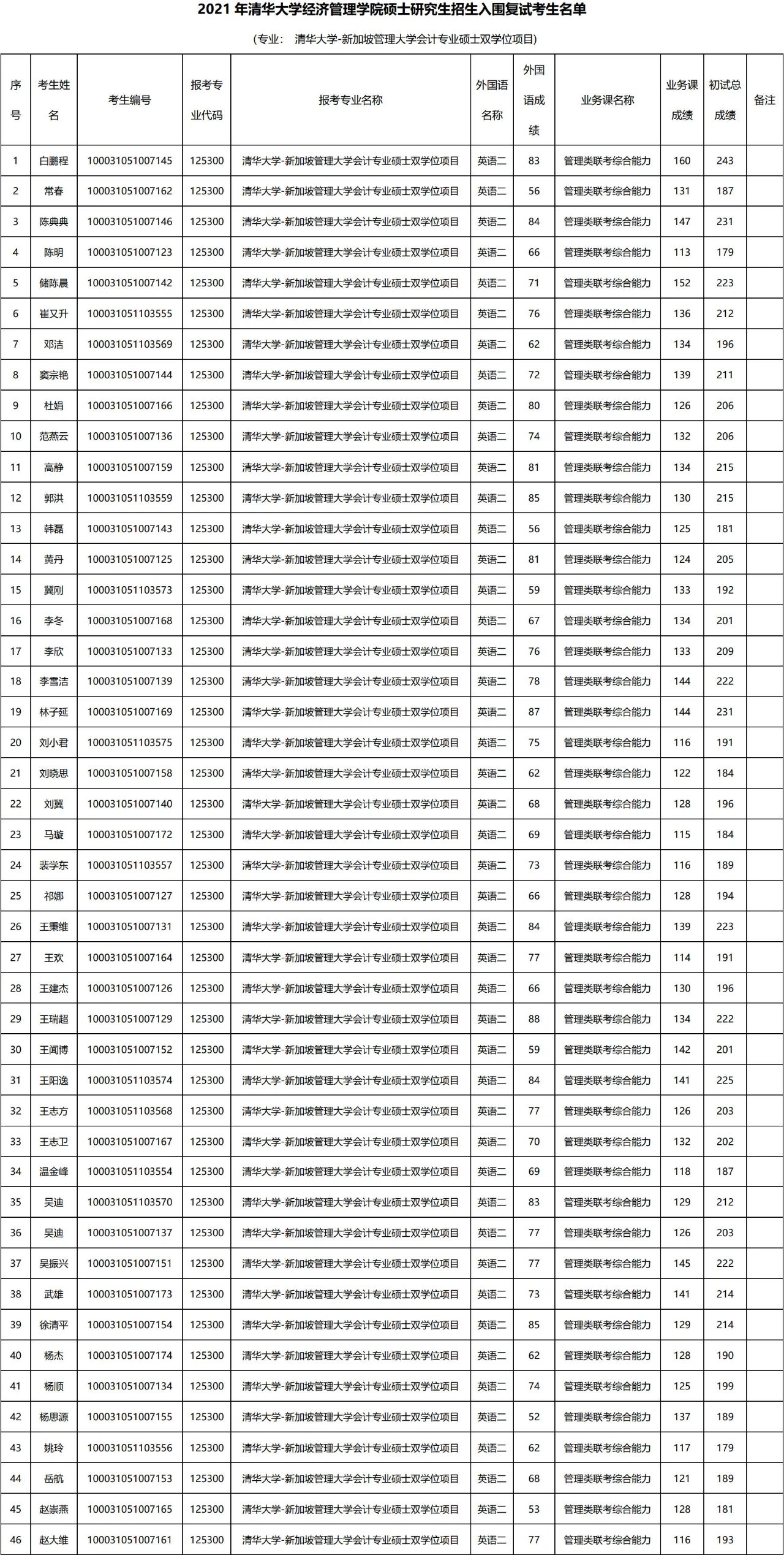 清华大学经济管理学院2021年硕士研究生入围复试名单