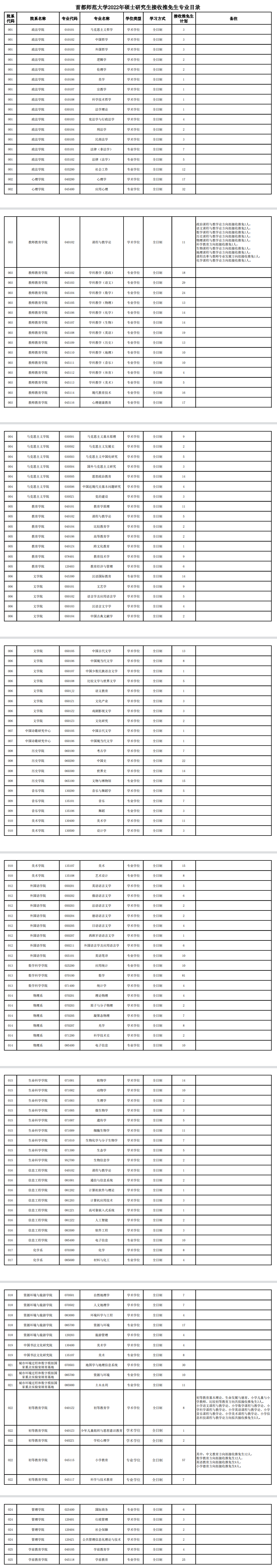 2022年首都师范大学硕士研究生接收推免生专业目录及招生计划公布