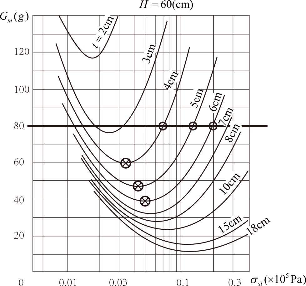 3、一产品重力为600N,底面尺寸为40cm×40cm。等效跌落高度为60cm,产品许用脆值为80(g)。图1为选用缓冲材料的最大加速度-静应力曲线,在厚度为4、5、6cm中选择作产品缓冲包装设计,试计算给出最省材料的缓冲包装设计,并给出其衬垫配置方案。