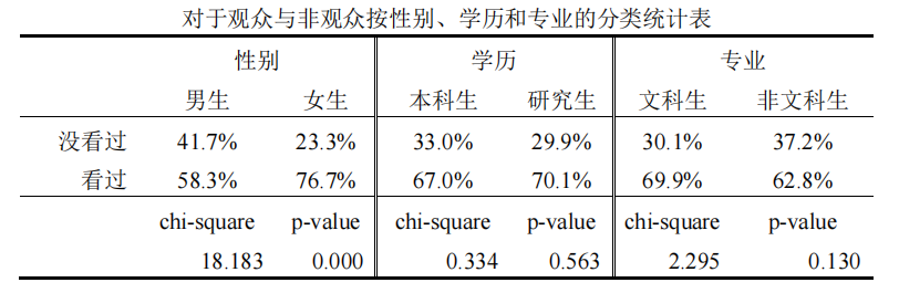 4、有一项有关大学生收看和认知“诗词大会”电视节目的调查,其中某大学回收有效问卷 446 份,分别按 性别、学历和专业对是否看过“诗词大会”得到频率汇总表如下,该表还分别给出了 chi-square 统计量及 相应 p-value。