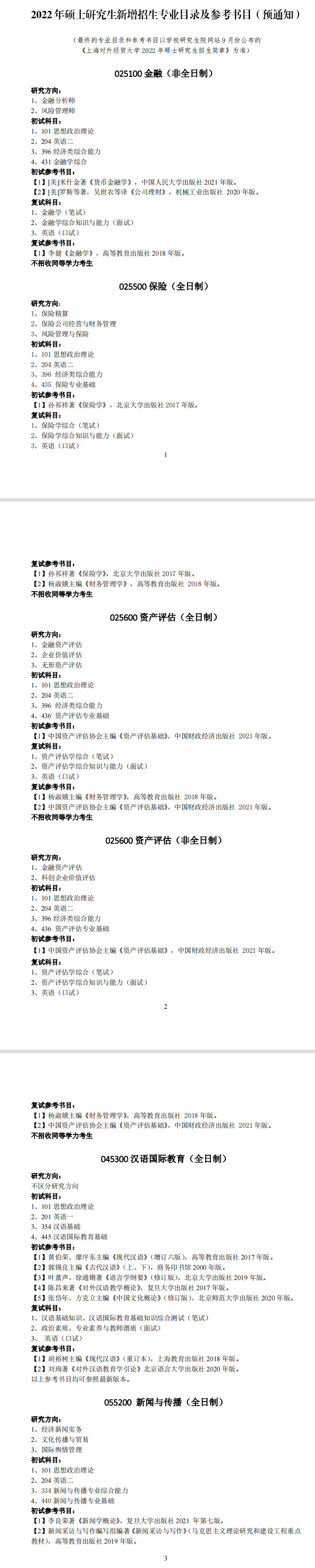为便于各位考生提前做好复习准备,现将新增招生专业的专业目录和参考书目公布如下。最终的专业目录和参考书目以学校研究生院网站9月份公布的《上海对外经贸大学2022年硕士研究生招生简章》为准。