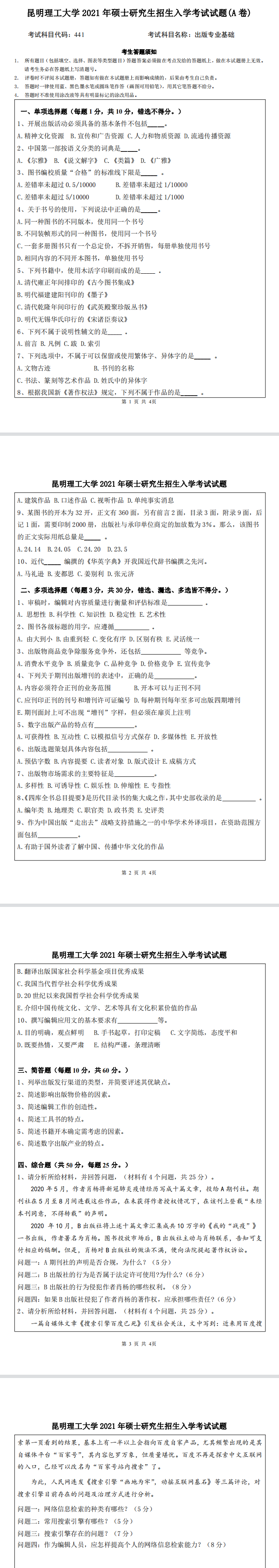 昆明理工大学考研辅导班:2021年昆明理工大学出版专硕考研441出版专业基础试题-新祥旭