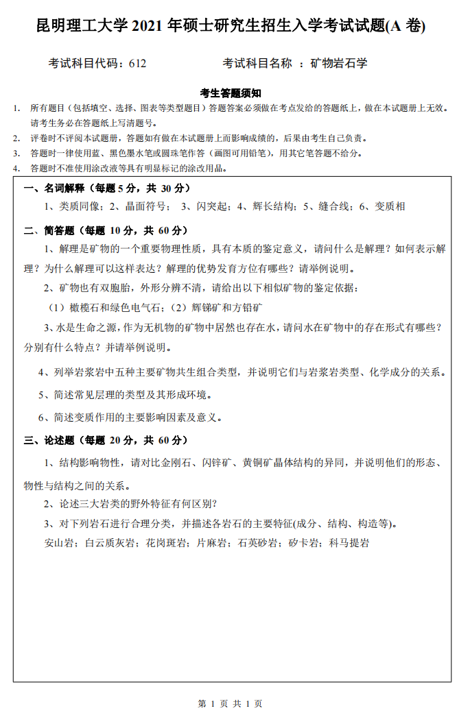 昆明理工大学考研辅导班:2021年昆明理工大学矿物学考研612矿物岩石学考试真题-新祥旭