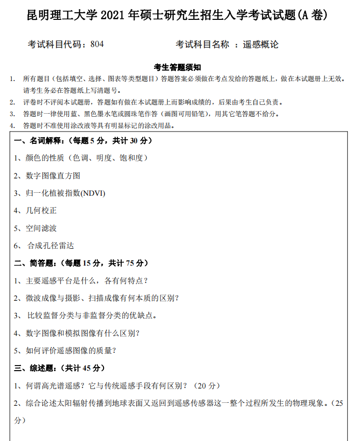 昆明理工大学考研辅导班:2021年昆明理工大学摄影测量与遥感专业考研804遥感概论考试真题-新祥旭