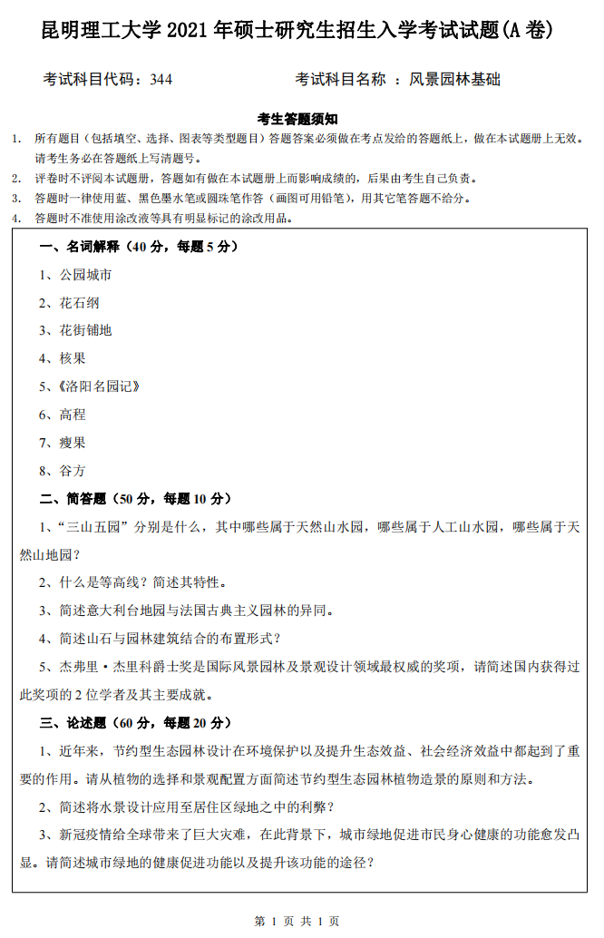昆明理工大学考研辅导班:昆明理工大学2021年研究生入学考试344风景园林基础考研真题