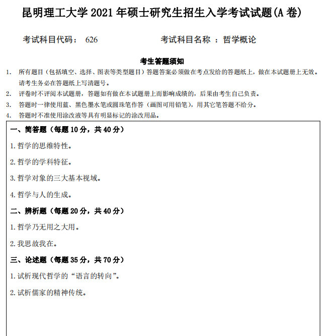 昆明理工大学考研辅导班:昆明理工大学2021年研究生入学考试626哲学概论考研真题