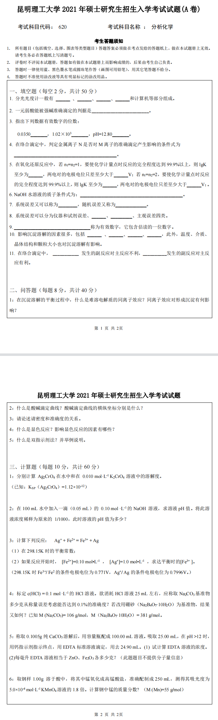 昆明理工大学考研辅导班:昆明理工大学2021年研究生入学考试620分析化学考研真题