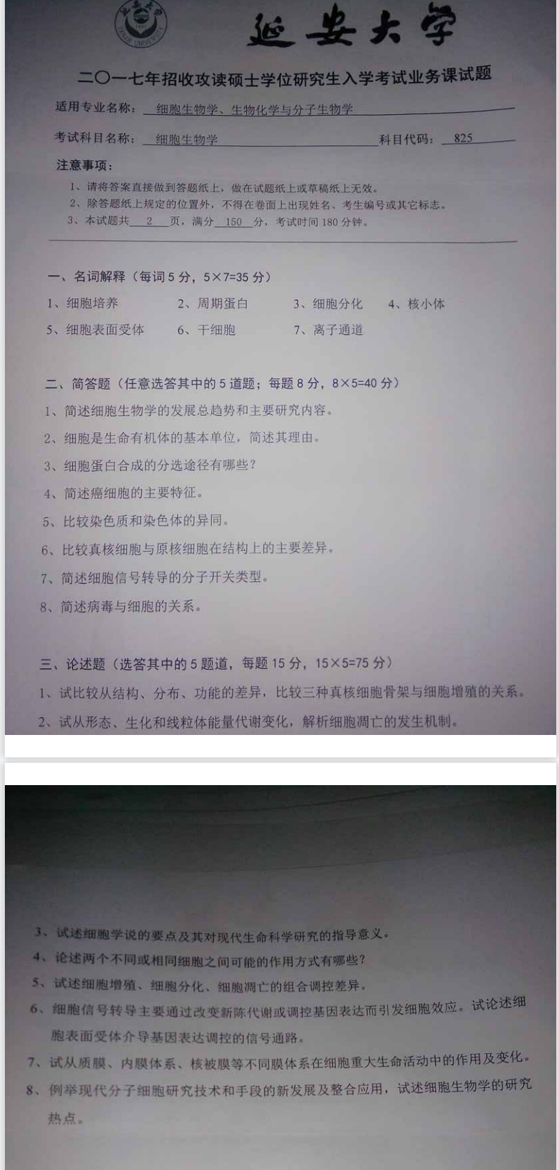 延安大学考研辅导班:2017年延安大学考研专业课825细胞生物学考试真题-新祥旭