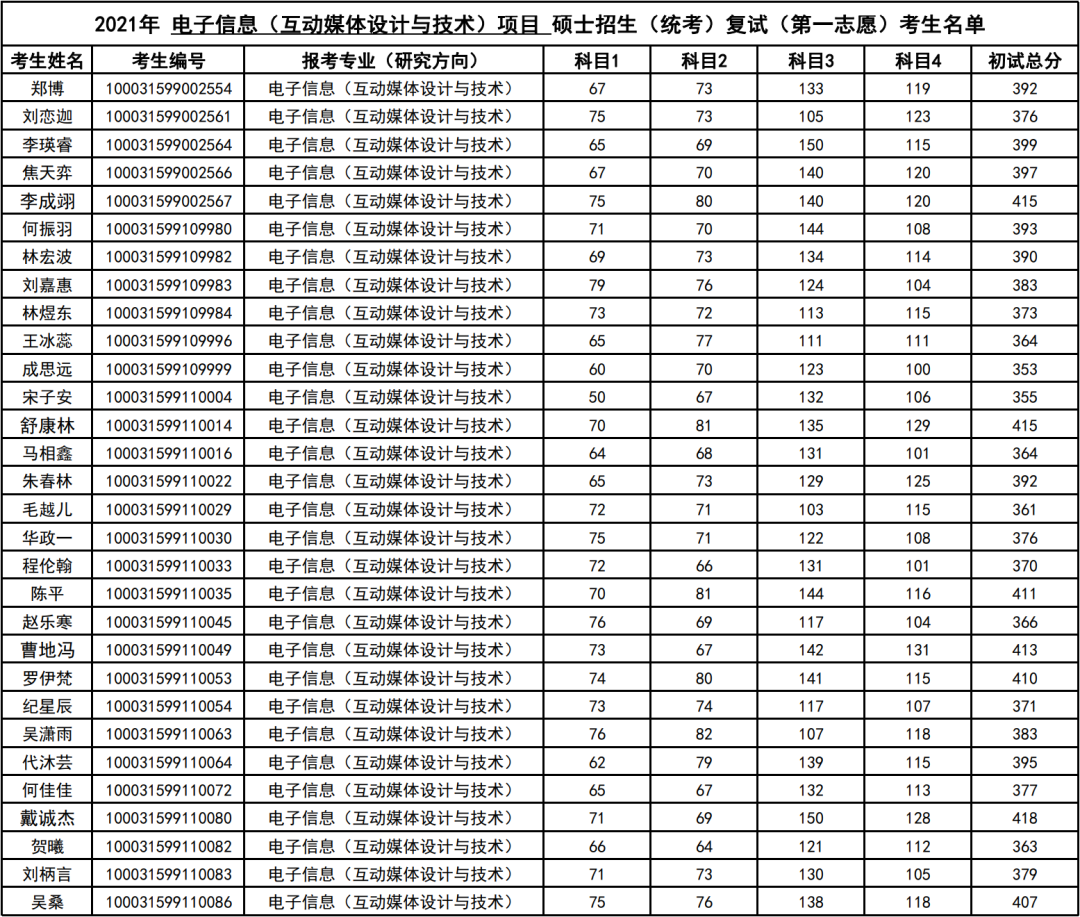 清华大学深研院2021年电子信息(互动媒体设计与技术)硕士生复试名单