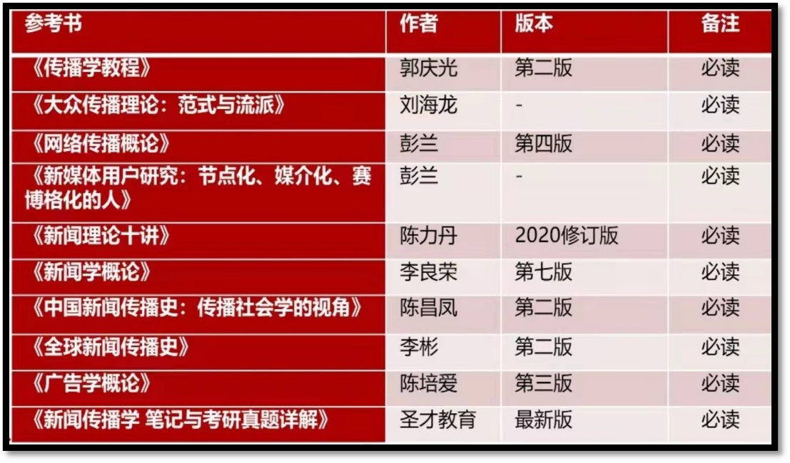 无论你考学硕还是专硕,以上的书目是你必须要读的,其中最重要的就是《传播学教程》《新闻学概论》《网络传播概论》,这三本书就是新传考研人的本命!除此之外,再给大家推荐基本进阶书目:德弗勒《大众传播效果研究的里程碑》第三版、刘海龙《重放灰色地带》以及刘海龙的《解析中国新闻传播学》(买最新版)。