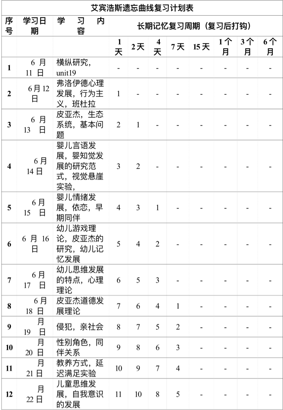 ③艾宾浩斯记忆曲线;就是用艾宾浩斯记忆表格背诵,我刚开始认为发展心理学最难背,所以我六月最先背的是发展心理学,用艾宾浩斯记忆曲线。缺点是背到后面要复习的越来越多,可能时间不够,并且也会产生主观的厌烦情绪。(如图)