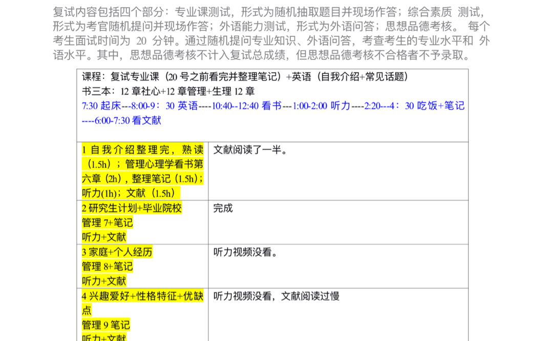 专业课:目标院校复试有三本教材,其中一本(社会心理学)在初试学习过,就主要加强背诵即可,另外两本书(生理心理学、管理心理学)需要精读。这两本书当中生理心理学略难,但是和初试的知识点也有交互,考得不会很深。我是用做笔记梳理框架结合历年真题的考点来背诵掌握知识点的。复试没有很注重细节的背诵,因为考的都是大题,所以只用梳理成逻辑的答题就行,抓关键词,串起来就可以的。下面是我的复试计划表,可以参考下。