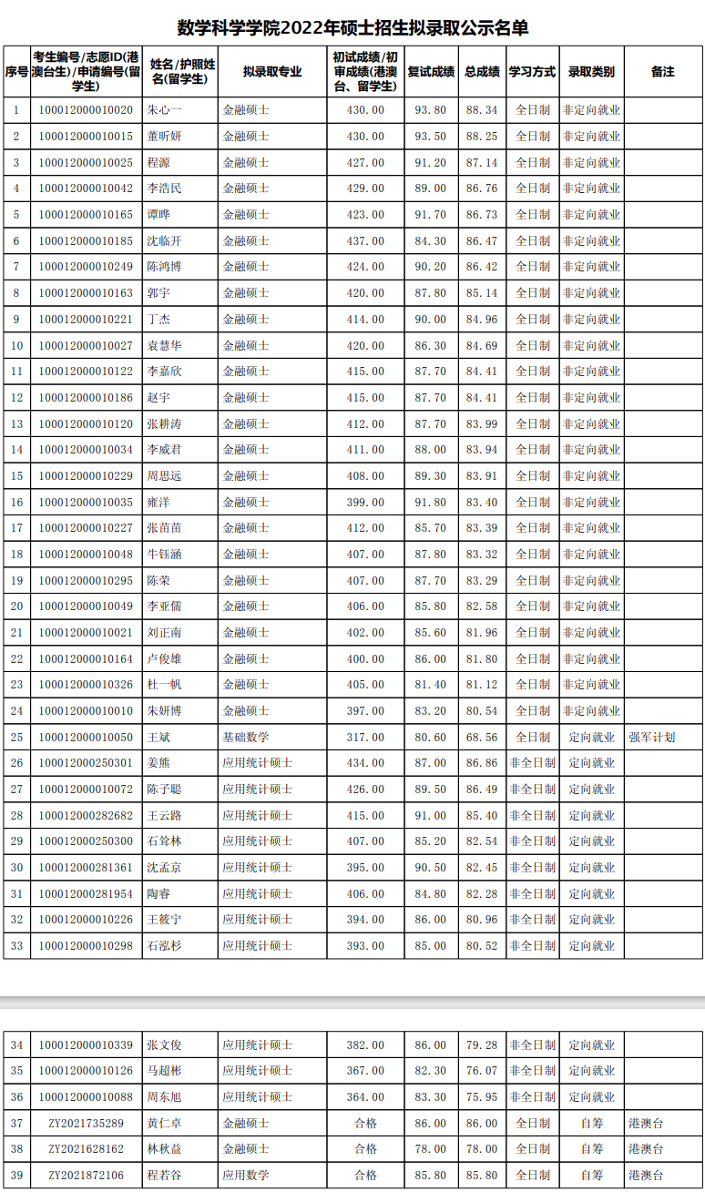 北京大学考研辅导班:北京大学数学科学学院2022年硕士招生拟录取公示名单