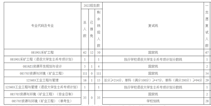 这是今年能源与矿业学院的复试线,大家可以很清晰的看到只要你过了国家线,就一定会有学上,历年的国家线就是该专业的复试线。北矿的矿业工程专硕一直以来都是招不满的,需要大量调剂名额。