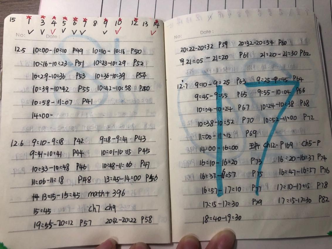 背书要高效的另一个关键是要专心,有些人喜欢读出声的背,有些人喜欢默背,我比较喜欢默背,因为动口总让我感觉不过脑子,嘴巴很机械地重复内容让我有一种自己看起来很努力地背的假象,当然大家对这个问题会有自己的见解,当然适合自己的是最重要的。我的绝招是记录自己背一页的时间点,这样不仅可以估计自己的背诵速度,也可以在自己分心的时候迅速让脑子清醒,一看到自己好长时间停留在某一页的背诵就会警醒自己要专注。并且在这一天结束时可以清楚的看到自己一天能背多少页。