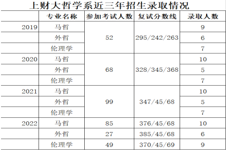 可以看到随着报考人数的增长,2019年到2022上海财经大学哲学系三个专业的复试分数线均逐年攀升,2022年的复试线已经达到了三百七八,并且预计上财大哲学系将被越来越多的同学熟悉。但各位决定报考的同学不用对2022年如此之高的复试线担心,根据笔者对考试大纲以及真题的研究,哲学系的考试总体不刁钻,以哲学基础知识和基本素养为主;差额复试的比例是1:1.2,复试不接收校外调剂,对第一志愿考生很友好;并且2022年外哲和伦理学专业都进行了扩招,增加了一到两个录取名额,大家不要过分担心呀。