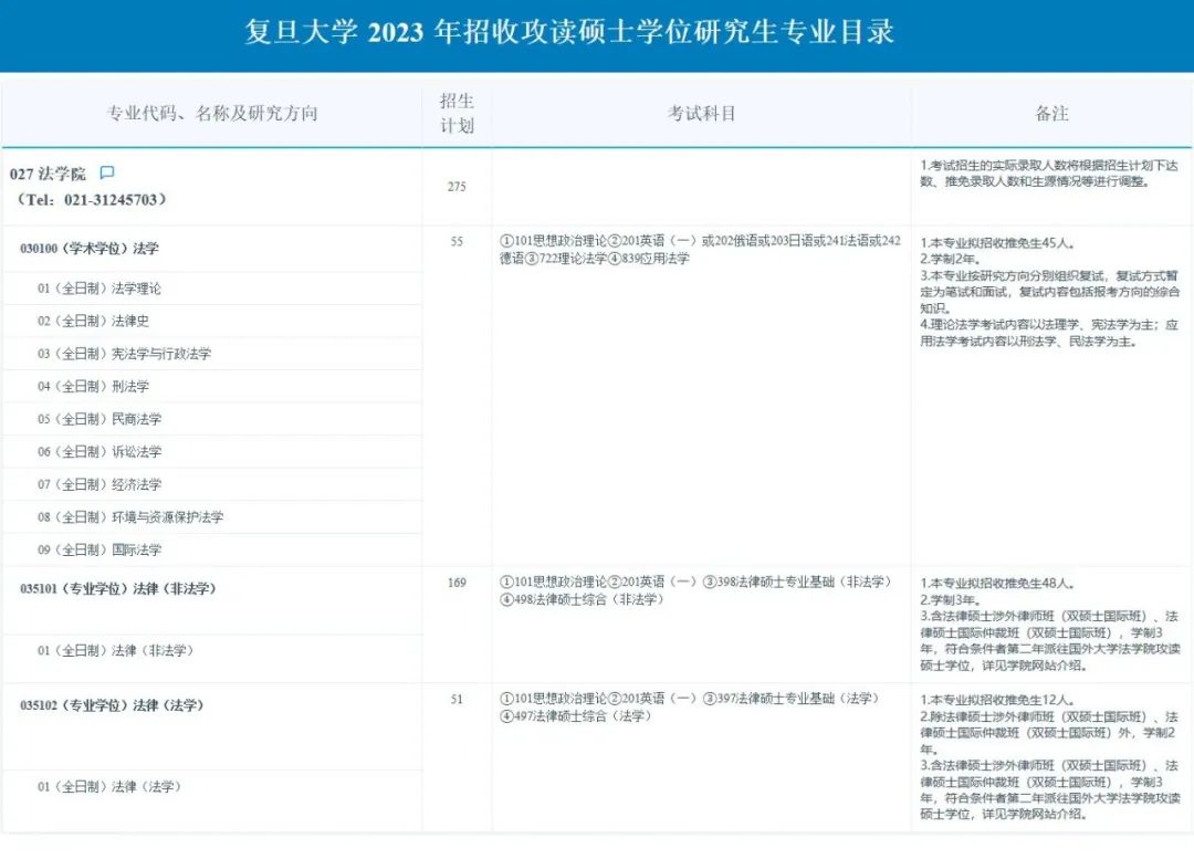 2023年复旦大学法学院考研专业目录