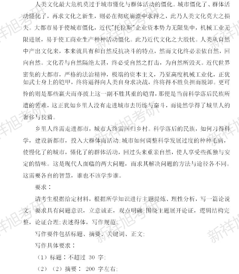 一、考试目的 本科目主要考查考生根据给定材料,运用所学知识进行主题提炼、 理性分析和文字表达的能力。 二、考核要点 1.主题提炼能力:具有问题意识,立意诚正,观点明确; 2.理性分析能力:围绕主题展开论证,逻辑结构完整,论证合理; 3.文字表达能力:表述得体,写作规范。 三、考试要求 1.根据给定材料完成一篇论说文; 2.写作要件包括标题、摘要、关键词、正文; 3.写作具体要求: (1)标题:不超过 30 字; (2)摘要:200 字左右; (3)关键词:3-5 个; (4)正文:2000-3000 字,至少应设置一级标题。