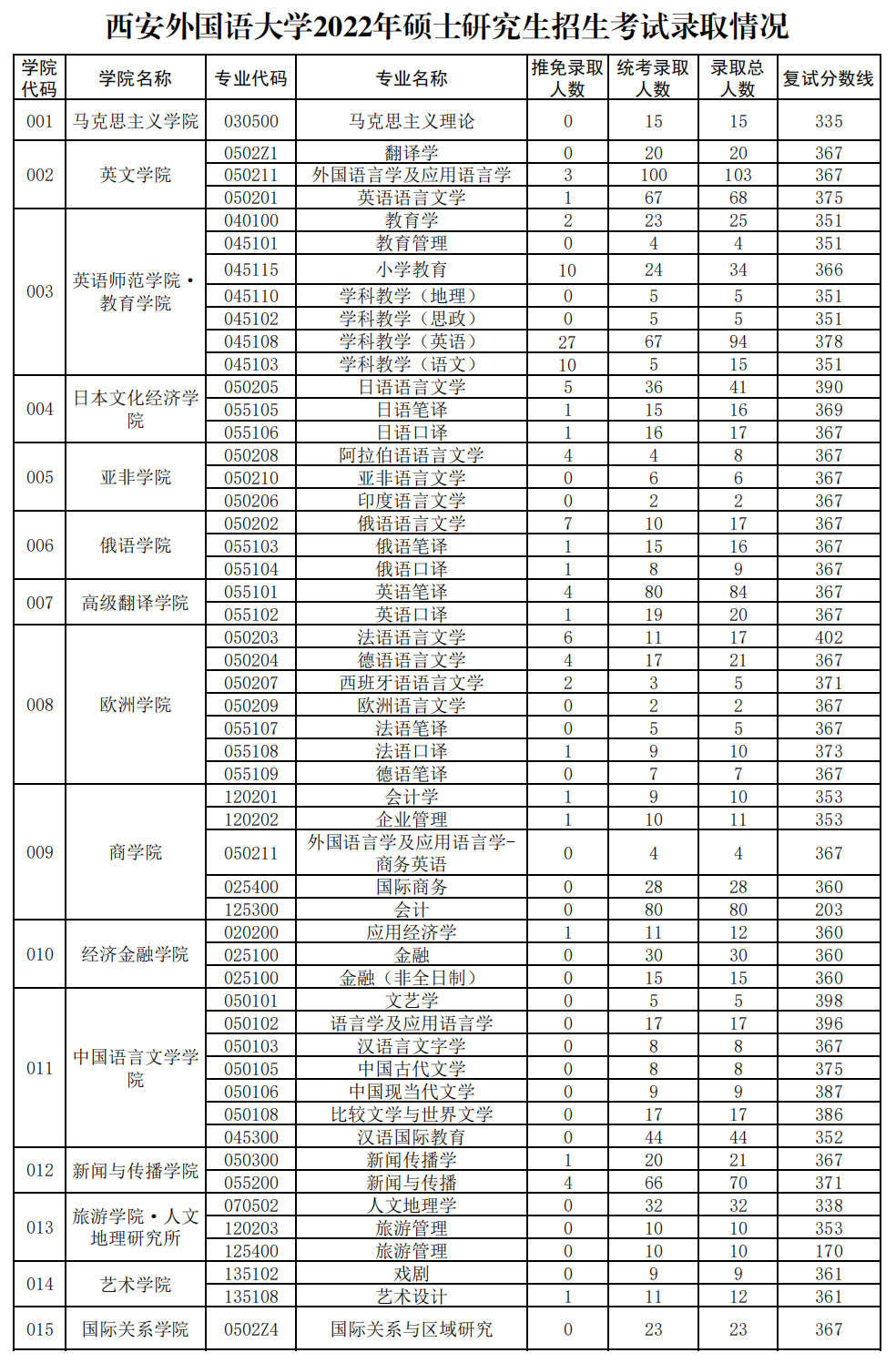 2022年西安外国语大学硕士研究生招生考试各专业报考录取情况