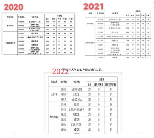 接下来谈一下江南大学食品学院的报录比。就2022年(如图),复试差额比(专硕)约1:1.2,学硕1:1.16。同时大家也能看到江南大学食品专业近年来属于扩招的状态,招生人数较别的院校多。此外,还得说一下2022年专业课改革,往年专业课是三选一(801生物化学或802化工原理或803微生物学),在去年七月多大纲调整为852食品科学与工程基础,即生化+化工。有很多同学因此换学校换专业等,而留下来的学生深知专业课的压力,这或许就是2022年江大食品学院复试分数线较低的原因吧。