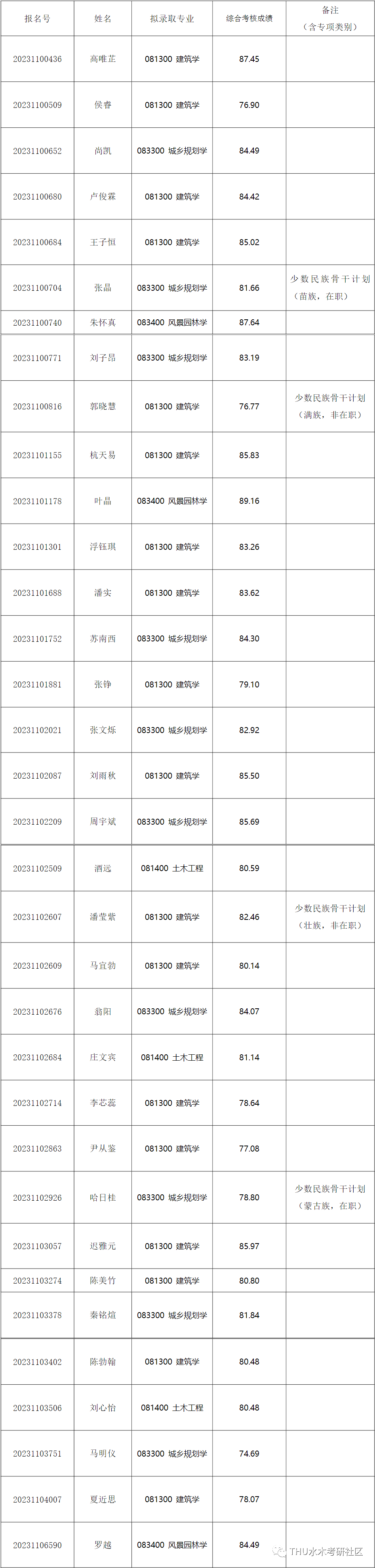 经综合考核和研究生招生工作领导小组讨论,报学校研究生招生工作领导小组批准,清华大学建筑学院2023年接收推荐免试直博生拟录取名单,现已确定,现予以公示