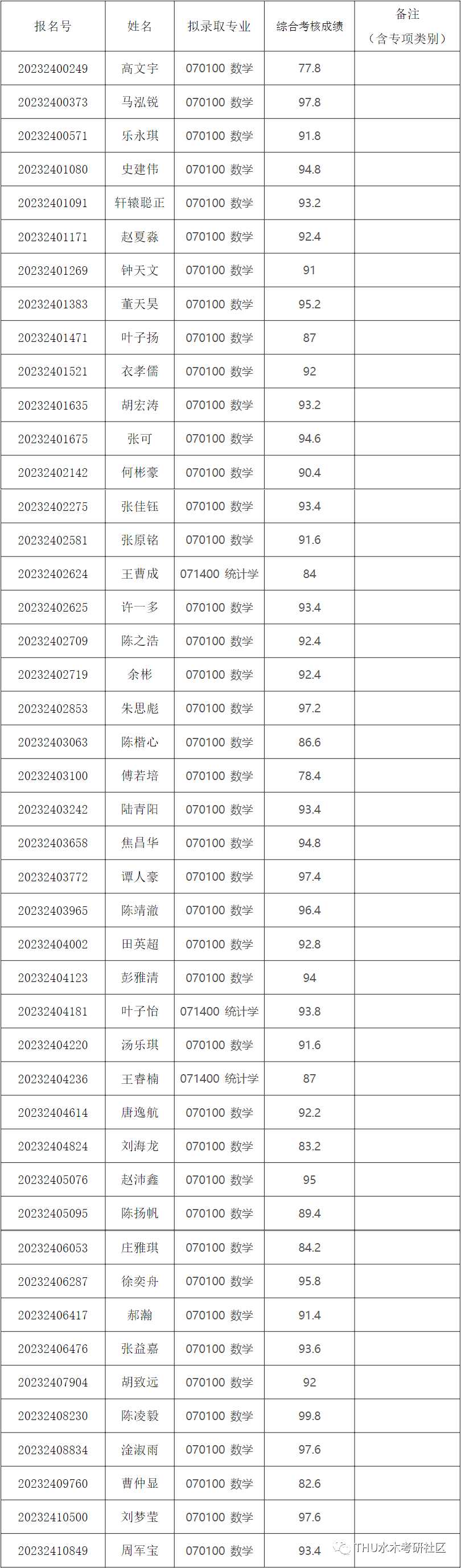 清华大学2023年数学科学系招收公开招考博士研究生拟录取名单公示