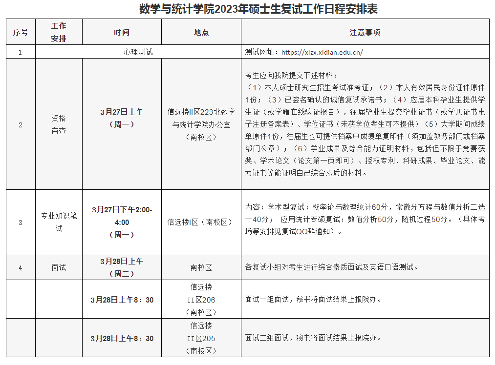西安电子科技大学2023年硕士研究生招生复试录取工作即将开始,根据教育部和学校相关文件要求,为全面做好西安电子科技大学2023年硕士研究生复试录取各项工作,结合我院实际情况,经数学与统计学院研究生工作领导小组和党政联席会议研究商定,现对数学与统计学院硕士研究生招生复试工作做出如下安排: