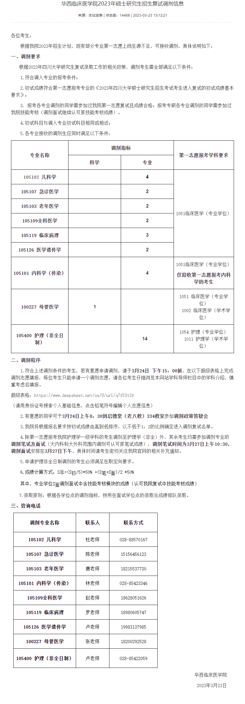 四川大学华西临床医学院2023年硕士研究生招生复试调剂信息