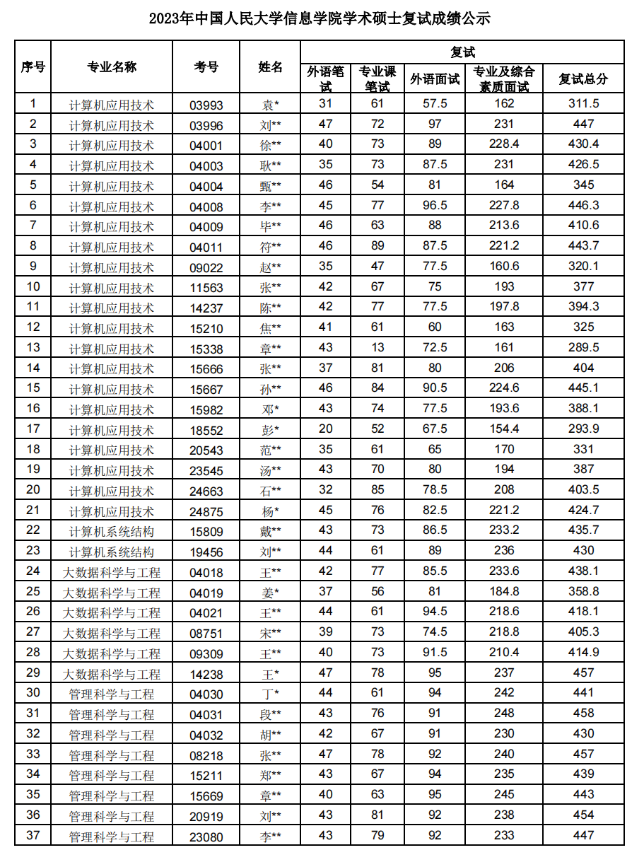 新祥旭考研:2023年中国人民大学信息学院学术硕士复试成绩公示