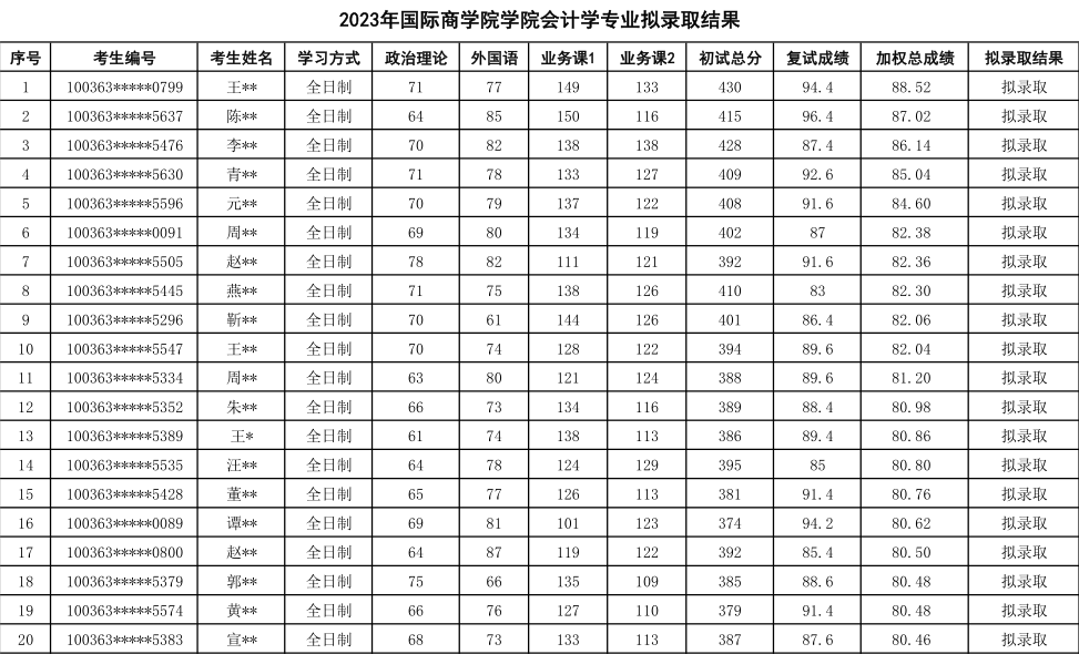 七、会计学专业2023年考研拟录取结果