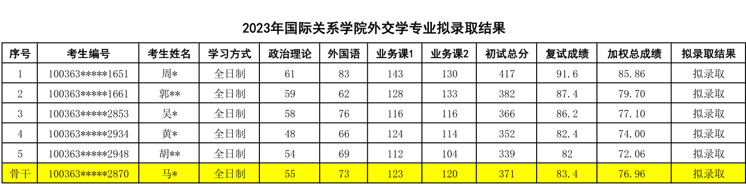 七、外交学专业2023年考研拟录取结果