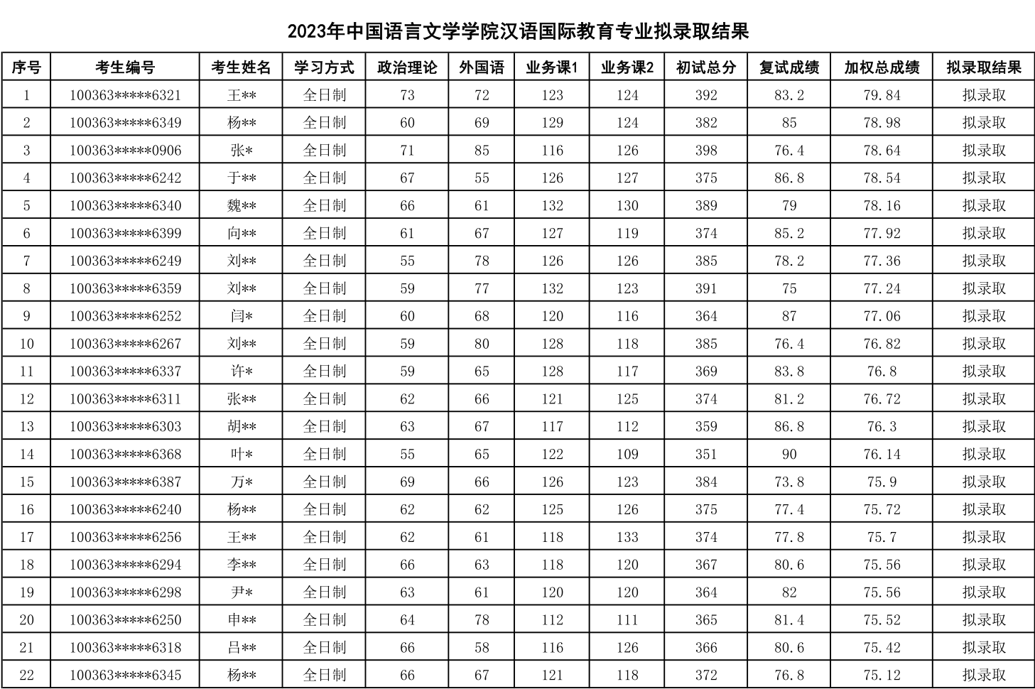 按照初试、复试成绩加权计算总成绩,并按照总成绩进行排名择优差额录取,初试和复试成绩的权重为70%和30%。计算总成绩时,初试成绩要转化为百分制。例如:考生初试成绩为380分(500分制),复试成绩百分制为80分(100分制),则加权总成绩为380÷5×70%+80×30%=77.2。