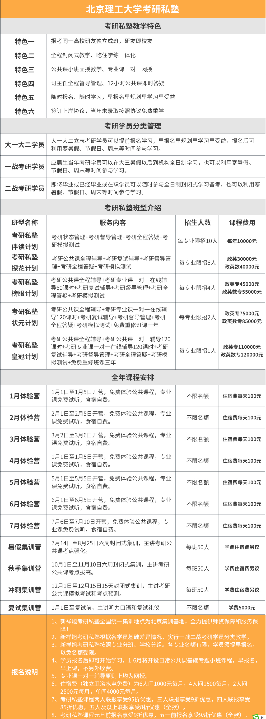 新祥旭考研机构开设有北京理工大学考研私塾课程,北京理工大学考研私塾为北京理工大学考研学子提供专属的封闭式集训学习环境,考研私塾全程封闭式教学、吃住学练一体化;公共课小班面授教学(PS:若公共课某科特别弱亦可单独再另咨一对一针对性补习)、专业课一对一面授或网授;班主任全程督导管理、公共课专业课即时免费答疑。考研学员随报随学,专业务实,真诚周到,助力上岸!