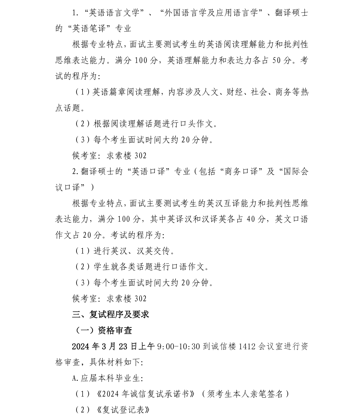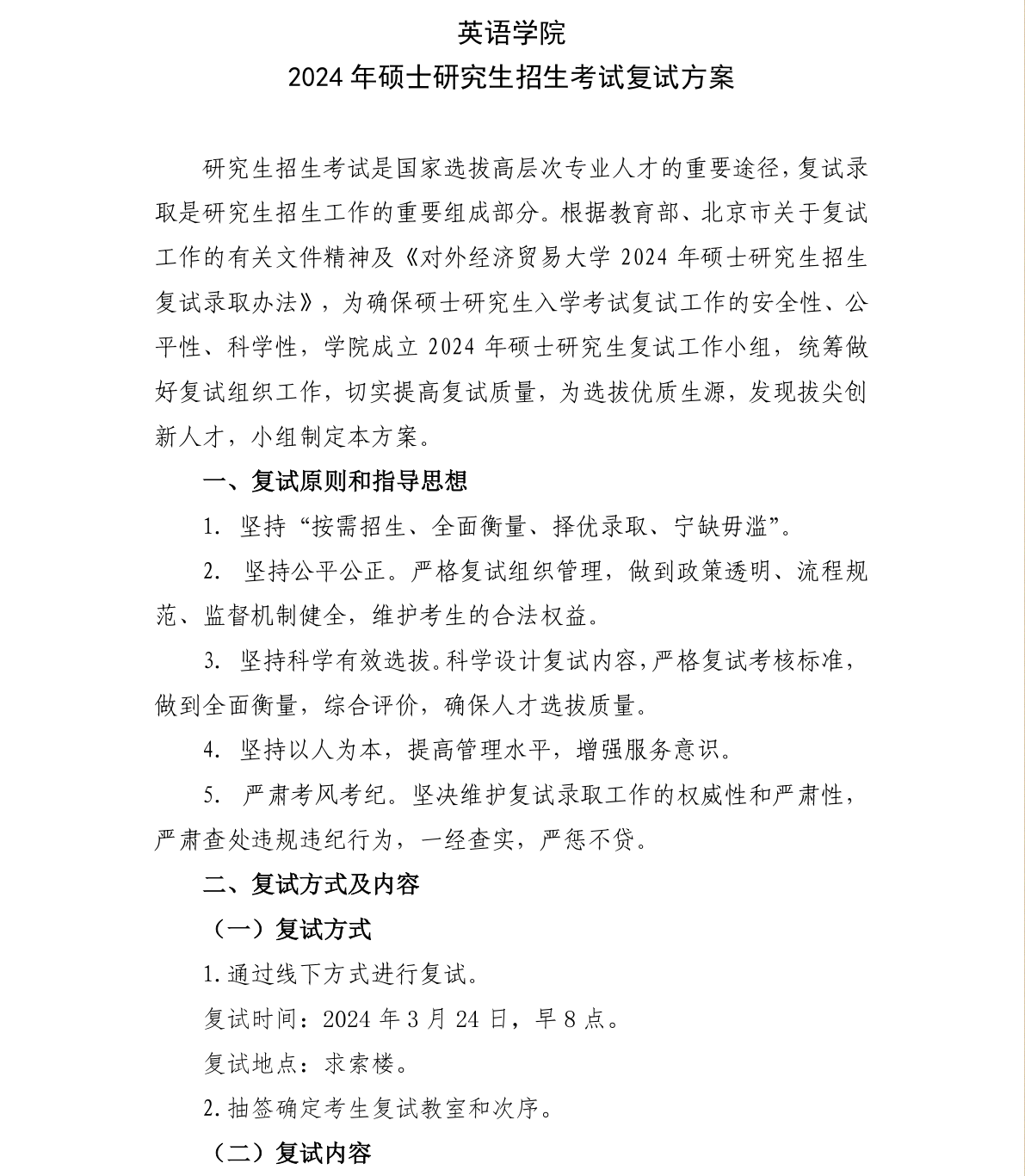 对外经济贸易大学英语学院2024年硕士研究生招生考试复试方案