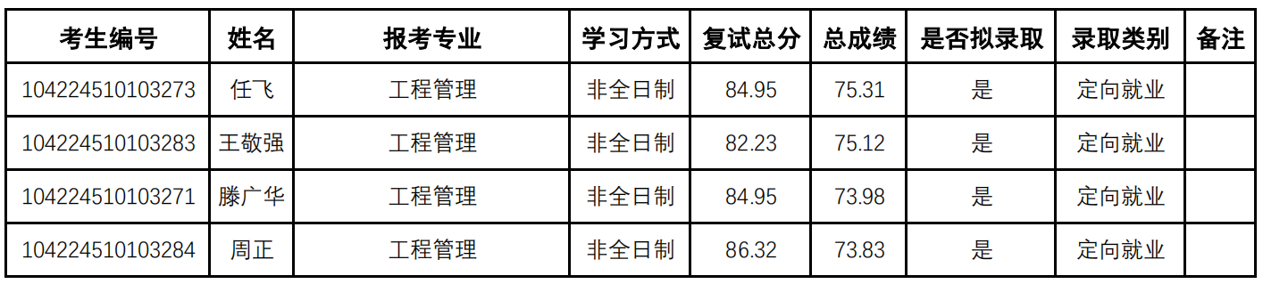 工程管理专业非全日制专业学位硕士研究生复试线为: