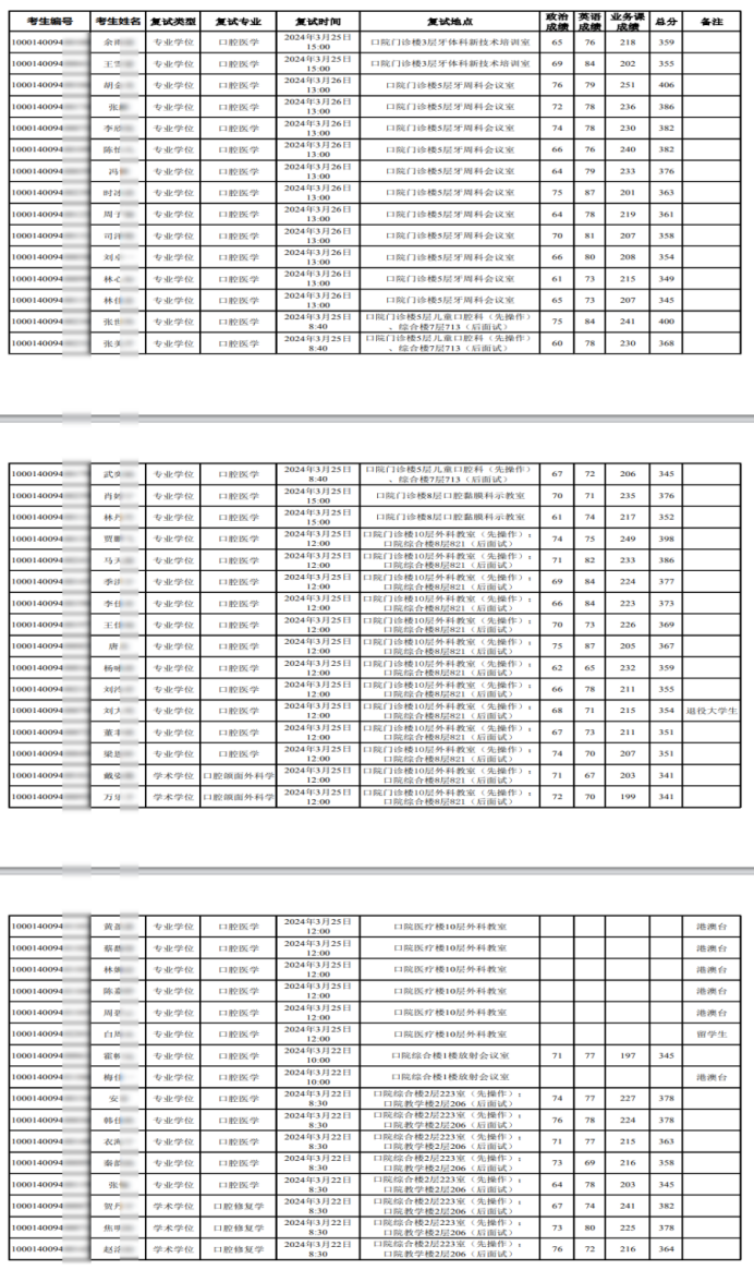1.复试分数线 2024年 学硕:政治55,外语55,专业课180,总分335 专硕:政治55,外语55,专业课180,总分310 2023年 学硕:政治50,外语55,专业课180,总分325 专硕:政治50,外语55,专业课180,总分325 2022年: 学硕:政治55,外语55,专业课180,总分320 专硕:政治55,外语55,专业课180,总分330 学硕:政治55,外语55,专业课180,总分340 专硕:政治55,外语55,专业课180,总分340 2.2024年北大医学部口腔医学考研录取名单 3.北大口腔医学考研复试录取规则 1.专业课、专业外语笔试 由口腔医学院各二级学科命题,卷面分数分别为100分。 (1)专业课:形式:笔试、闭卷;时间:1小时; (2)专业外语:形式:笔试、闭卷;时间:1小时; 注:港澳台、留学生的申请考生除参加上述专业课和专业外语的笔试外,还须参加两门专业基础课(口腔组织病理学、口腔解剖生理学)的笔试,形式为闭卷,卷面分数分别为100分,时间各2 小时。 2.面试内容及要求 (1)外语测试(听力和口语):有专门的听力环节,其他具体考察方式由各学科自定; (2)专业和基础知识面考查:主要考查考生掌握本学科专业知识和相关基础知识的广度和深度,以及运用所学知识分析、解决问题的能力; (3)应用能力考查:包括科研技能和专业实践技能。根据招收学生的类型不同,考察重点可有所不同。考察方式由各学科自定; (4)综合素质考查:考查考生的综合素质,包括政治素质、思想品德、科研诚信、医德医风、表达能力、逻辑思维、沟通协调能力、创新精神等。 3.评分方法 复试成绩采用综合计分办法,实行百分制,60分及格,见下表: 考核项目 专业课 专业外语 面试 复试成绩 权重 15% 10% 75% 100% 招生考试总成绩=初试成绩总分/5*0.5+复试成绩*0.5 4.录取 进入复试的考生,在复试各项成绩及格基础上,按照招生考试总成绩(初试成绩总分/5*0.5+复试成绩*0.5)排序择优录取,并报医学部研招办审核后公布。 思想政治品德考核不合格者不予录取。