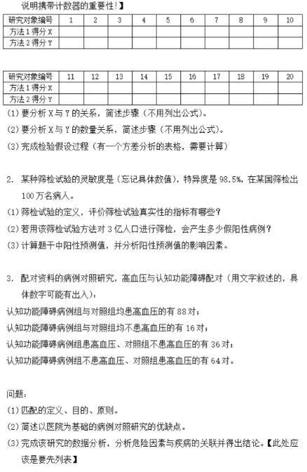 考试大纲:流行病学、卫生统计学、社会医学。 1.考试方式:闭卷、笔试。 2.考试时间:180 分钟。 3.试题分值:300 分。 4.题型及分数比例: (1)名词解释,共 10 个,每题 5 分,共 50 分。 (2)A1 型选择题,共 20 个,每题 3 分,共 60 分。 (3)简答题,共 9 个,每题 10 分,共 90 分。 (4)论述/计算题,共 5 个,每题 20 分,共 100 分。 参考书单: 《流行病学》 《卫生统计学》(要求:掌握重要概念要求掌握对应的英文术语。) 张拓红主编. 社会医学(第 2 版). 北京:北京大学医学出版社. 2010 年