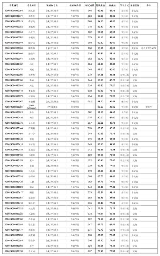 1.复试分数线 2024年 学硕:无招生 专硕:政治55,外语55,专业课180,总分320 2023年 学硕:政治50,外语55,专业课180,总分310 专硕:政治50,外语55,专业课180,总分325 2022年: 学硕:政治,外语,专业课,总分 专硕:政治,外语,专业课,总分 学硕:政治55,外语55,专业课180,总分365 专硕:政治55,外语55,专业课180,总分310 2.2024年录取名单 3.公共卫生复试录取规则 1.复试内容:专业课和专业外语考试、复试专家组面试(含英语听力及口语)。包括思想政治素质、学科知识结构、科学研究潜力和外语水平能力的考核。 2.复试小组成员按照《北京大学医学部招收攻读硕士学位研究生复试考核无记名评分表》分别进行无记名评分,平均分即为考生的面试分数,记入《北京大学医学部招收攻读硕士学位研究生复试考核成绩表》内。 3.复试成绩采用综合计分办法,实行百分制,60分及格。招生考试总成绩=初试成绩总分/5×0.5+复试成绩×0.5。在复试成绩及格的基础上,按照学科方向招生考试总成绩排序择优录取。港澳台、留学生招生考试总成绩按复试成绩上报(无初试成绩)。复试成绩不合格的考生不予录取。 4.学院将遵循实事求是的原则,在复试和录取过程中对考生进行思想政治素质和品德考核,主要考核内容包括考生的政治态度、思想表现、道德品质、遵纪守法、诚实守信等方面。思想品德考核不合格者不予录取。 5.考生应确保报考材料及复试过程的真实性,入学后3个月内,本校可按照《普通高等学校学生管理规定》有关要求,对所有考生进行全面复查。复查不合格的,取消学籍;情节严重的,移交有关部门调查处理。