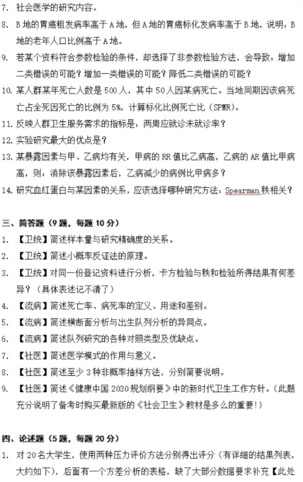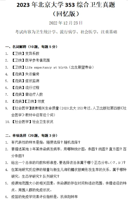 一、北大公卫专业课240分都是名词解释、简答和论述,不背肯定不行。前期多学习统计和流行病,后期多学习流行病和社会医学;前期学习理解科目,后期学习背诵科目。 (一)专业课 流行病:主流教材是人卫八版,但是人卫七版中,偏倚是单独的一章,建议细看;北医有流行病的官方MOOC,建议细看,包括课后习题,有余力南医的流行病学MOOC也刷一遍。 卫生统计学:学习的过程建议不要细挖,钻牛角尖,比如假设检验中,不要去思考“不拒绝H1的概率有多大”这种问题,(如果明确要学统计方向,那需要细挖)。 统计:前期的学习,有基础的同学建议听赵耐青老师的课程,没有基础的同学可以在MOOC上找最新的名校课程先过一遍,未来明确要学统计方向的同学建议概率论与数理统计也需要稍微了解一下。 社会医学:不建议前期就看,除北医官方教材,人卫教材也需要看,只背北医教材知识点可能不够;如果能独立把课本大体框架梳理出来,社会医学学习就不建议大量刷课,直接背,背就完事了。 北医六月左右公共卫生学院会有暑期学校,有余力的同学可以试着申请。暑期学校是北医公共卫生学院举办的一个活动,本科生都会允许参加,不是夏令营那种门槛很高的,参加的学生通过考核会发一个与北大相关的证。重视北医公卫官方的考试大纲,建议打印出来,学习迷茫的过程时可以把大纲拿出来,一个一个的回忆知识点。真题的建议,教材和真题一样重要,通过真题我们可以在考试前期了解考试重点,后期模拟做真题可以让我们在真正考试时更好适应考试环境。刷题的建议:不建议大量刷题,建议多背书。如果很想刷题,建议刷课本例题和教材后面的题(统计真题选择题难度和教材后练习题难度相当),北医出版的流行病学应试指南每章后面也有相应例题。此外,北医流行病学MOOC和中山统计MOOC慕课有对应习题,建议先练这些。 (二)政治 作为妥妥的理科生,高中就对政治历史这类学科深恶痛绝,所以开始准备的时候真的是超痛苦。因为我知道自己很不擅长,所以早早就开始准备了,大约3月份就跟着网课学了。因为懒得找资料,所以就买了一个全程班,现在市面上有很多课程,大家可以先听一些试听课,再确定跟哪个老师,决定好了就不要中途怀疑,跟定他/她就行了,基本上老师讲的内容都不会有什么差别的,而且北京本来就压分,很难得高分的,也很难与别人拉开差距。考研政治使用的资料有《肖秀荣1000题》《腿姐背诵手册》,3—10月就是听课刷选择题,背诵手册我看了2遍,建议前期把选择题知识点都做到熟悉,因为后期有很多时政大题要背,选择题就很难提升了。10月份陆陆续续开始背一些大题,主要看你跟的老师,就按照他说的背就行了,不用着急,因为时政要等到最后才能出来,而且背了也很容易忘记。11月开始基本上大题都出来了,直接背就行,同时开始做模拟题,我就做了腿姐的题目,肖秀荣的来不及做了。这个阶段主要练的就是做题的感觉以及能否把背诵的素材运用起来。我一般是早上起床和晚饭后各背一小时,然后下午做一套题,政治主要就靠后期背大题,虽然很痛苦但还是有效果的。考试的时候大题都是我背过的,反正想到什么就写什么就行,我不追求高分哈哈哈。 (三)英语一 考研英语我开始的比较早,大约一月份就开始背单词,我用的单词书是《考研单词一笑而过》,这本比《红宝书》单词量少,去掉了”a'””the”这类的简单词汇,背得快一些。我觉得背单词是一种习惯,尤其对于考研英语这种非常吃单词的考试,是非常重要的,所以大家一定要尽早开始背单词,每天至少半小时,睡前再回顾一下,这对于后期刷题都可以很大地提升自信的!此外,我大约3月份开始做六级阅读,因为考研真题很宝贵,于是我就先做六级的阅读,保持感觉。6月份开始做真题阅读,每天两篇。一开始不用太在意正确率,但一定要分析为什么做错,同时可以看一些阅读技巧,b站蛮多的,一边学技巧一边用做题来验证,逐渐形成自己的技巧。考研真题的阅读我做了两遍,然后开始做小三门,后期时间不是很够,就背了几篇作文就上考场了,果然练的少的就做的不太顺利哈哈,排序题硬是做了30分钟(还做错了),阅读北京压分,也没得多少分。分数也就中等吧,没有很高但也还行。