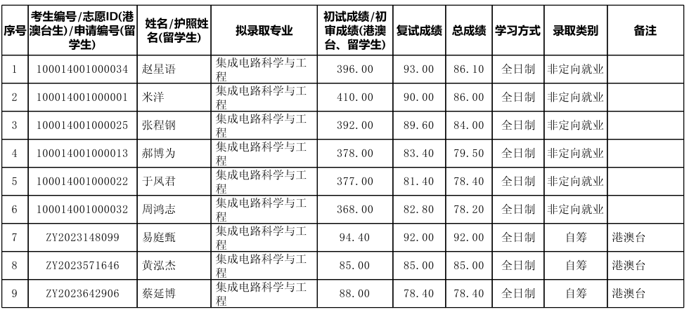 一.招生人数: 2025年招生目录公布招生计划:18人,其中推免14人,统考4人。 备注:在北京大学新燕园校区(地点:北京市昌平区)招生。考试科目④集成电路基础,使用北京大学深圳研究生院信息工程学院试题。 【深圳研究生院】 140100集成电路科学与工程(参考2025年招生目录) 00.不区分研究方向 初试科目: ①101思想政治理论 ②201英语(一) ③301数学(一) ④854集成电路基础 招生人数: 2025年招生目录公布招生计划:61人,其中推免40人,统考21人。 备注:本专业学习年限3年。 二、历年分数线 【集成电路学院】 2024年:55、55、90、90、360 2023年:50、55、90、90、315 历年复试录取情况 2024年 一志愿复试8人,410、396、392、383、378、377、368、362 录取6人,410、396、392、378、377、368 2023年 一志愿复试11人,414、391、380、377、368、356、349、341、323、320、317 录取7人,414、391、380、377、368、356、349 【深圳研究生院】 2024年:55、55、90、90、310 2023年:50、55、90、90、310 历年复试录取情况 2024年 录取21人,录取最高分419,最低分345 2023年 录取18人,录取最高分385,最低分317 三、往年复试细则 以2024年为例(集成电路学院) 1.复试分数线: 普通计划单科:政治55分,英语55分,业务课一90分,业务课二90分; 普通计划总分:360分。 2.复试基本内容:学科知识结构、科学研究潜力、英语水平能力、思想政治素质等。 3.成绩权重:初试成绩占总成绩的50%,复试成绩占总成绩的50%。 4.英语听力及口语测试均在复试中进行,成绩计入复试总成绩。 5.总成绩计算公式:总成绩=50%×初试总成绩/5+复试成绩(百分制)×50%。 6.复试成绩满分为100分,60分及格,不及格的考生不予录取。拟录取名单依据专业招生计划以及总成绩名次确定。 四、2024年北大集成电路科学与工程录取名单编辑搜图