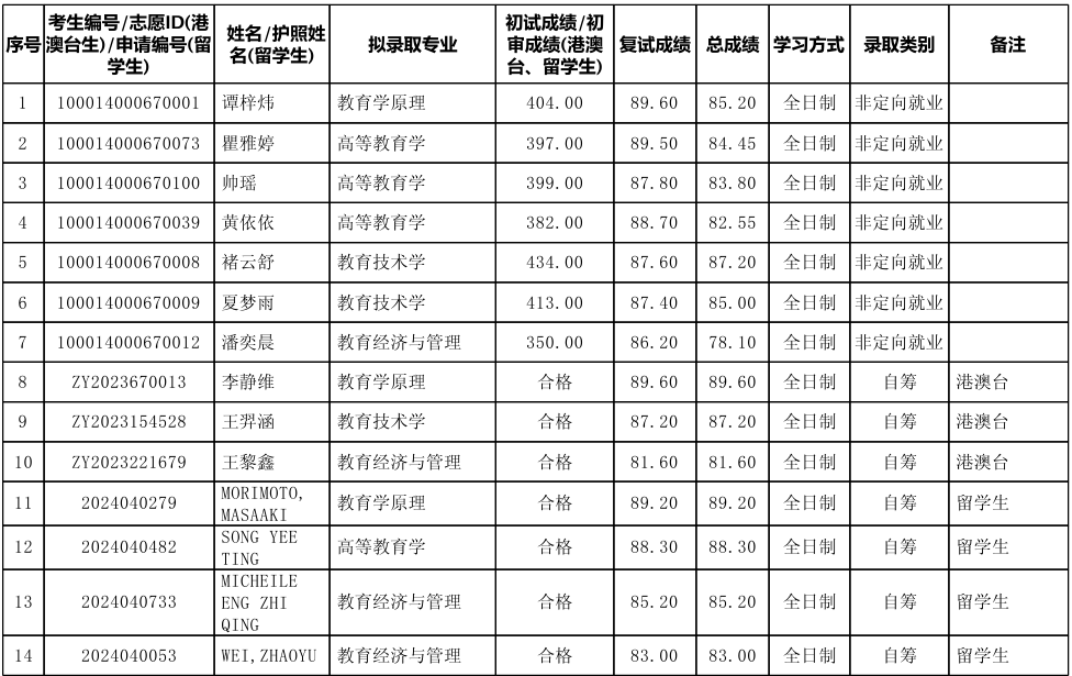 北京大学教育学(医学教育)考研复录数据 ①考研复试线: 2024年:总分355、政治55、英语55、专业课180; 2023年:总分355、政治55、英语55、专业课180; 2022年:总分355、政治55、英语55、专业课180; 2021年:总分340、政治55、英语55、专业课180; 2020年:总分340、政治55、英语55、专业课180; ②录取数据: 2024年复试0人,录取0人; 2023年进复试:3人(384、383、374) 2023年拟录取:2人(374、384) 2022年进复试:2人(356、355) 2022年拟录取:1人(356) 2021年进复试:3人(378、365、350) 2021年拟录取:2人(378、365) 2020年进复试:3人(422、385、342) 2020年拟录取:2人(422、385) ③北京大学教育学院考研复试细则 初试成绩出来后,如果大概率能进复试,可以参考前一年的要求,准备如下的材料: 1.《报考攻读硕士学位研究生登记表》; 2.个人陈述:包含学术背景、与报考专业相关的研究经历、攻读研究生阶段的学习和研究计划、毕业后的就业目标等; 3.有效身份证件复印件(正反面印在一页A4纸上); 4.学历学位证书复印件(应届生为学生证原件); 5.毕业学校正式成绩单复印件(现场须核验原件); 6.本科毕业论文全文(应届毕业生须提供开题报告或论文初稿); 7.《诚信复试承诺书》签署后原件(见附件); 8.现场面试用ppt(8分钟之内;截止时间之后,不接受任何更换请求;仅电子版即可) 9.其他能证明自己学术科研水平的作品;(非必须项) 复试基本内容: 复试组将对学生的学科背景、专业素质、外语口语水平、研究能力、思维能力、创新能力等方面进行综合考察 复试和录取规则: 复试权重及最终成绩(百分制):50%*初试各门总成绩/5+复试成绩*50%=最终成绩; ④北京大学教育学院考研录取名单编辑搜图