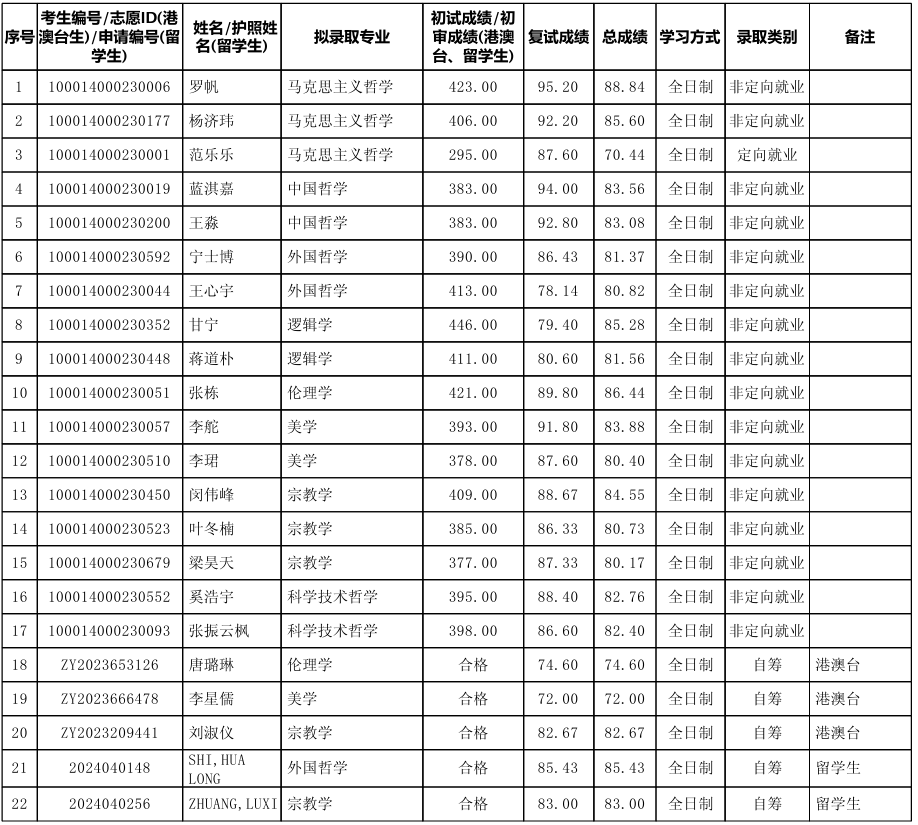 一.复试分数线 24年:总分355、政治55、英语55、专业课90/90 23年:总分350、政治50、英语55、专业课90/90 22年:总分355、政治55、英语55、专业课90/90 21年:总分355、政治55、英语55、专业课90/90 20年:总分355、政治55、英语55、专业课90/90 19年:总分355、政治55、英语55、专业课90/90 18年:总分355、政治50、英语50、专业课90/90 二.录取信息 2024录取 进复试:4人(413、390、377、362) 最终录取:2人(390、413) 2023录取 进复试:4人(395、362、358、356) 最终录取:2人(395、356) 2022录取 进复试:6人(388、387、385、385、378、377) 最终录取:3人(388、377、378) 2021录取 进复试:6人(409、403、398、392、378、377) 最终录取:4人(403、392、409、398) 2020录取 进复试:2人(360、359) 最终录取2人(360、359) 2019录取 进复试:1人(365) 最终录取:1人(365) 2018录取 进复试:4人 最终录取:4人(最高分404、最低分366) 三.24年复试细则 初试成绩占总成绩的60%,复试成绩占总成绩的40%;复试成绩采用百分制,60分为及格。复试成绩不及格者,不予录取。总成绩=初试总成绩/5*60%+复试(包括外语考核)成绩*40%。复试结束后,按照招生计划,根据总成绩从高到低初取,初取名单经哲学系招生工作小组审核后报研究生院审批。 四.2024年录取名单