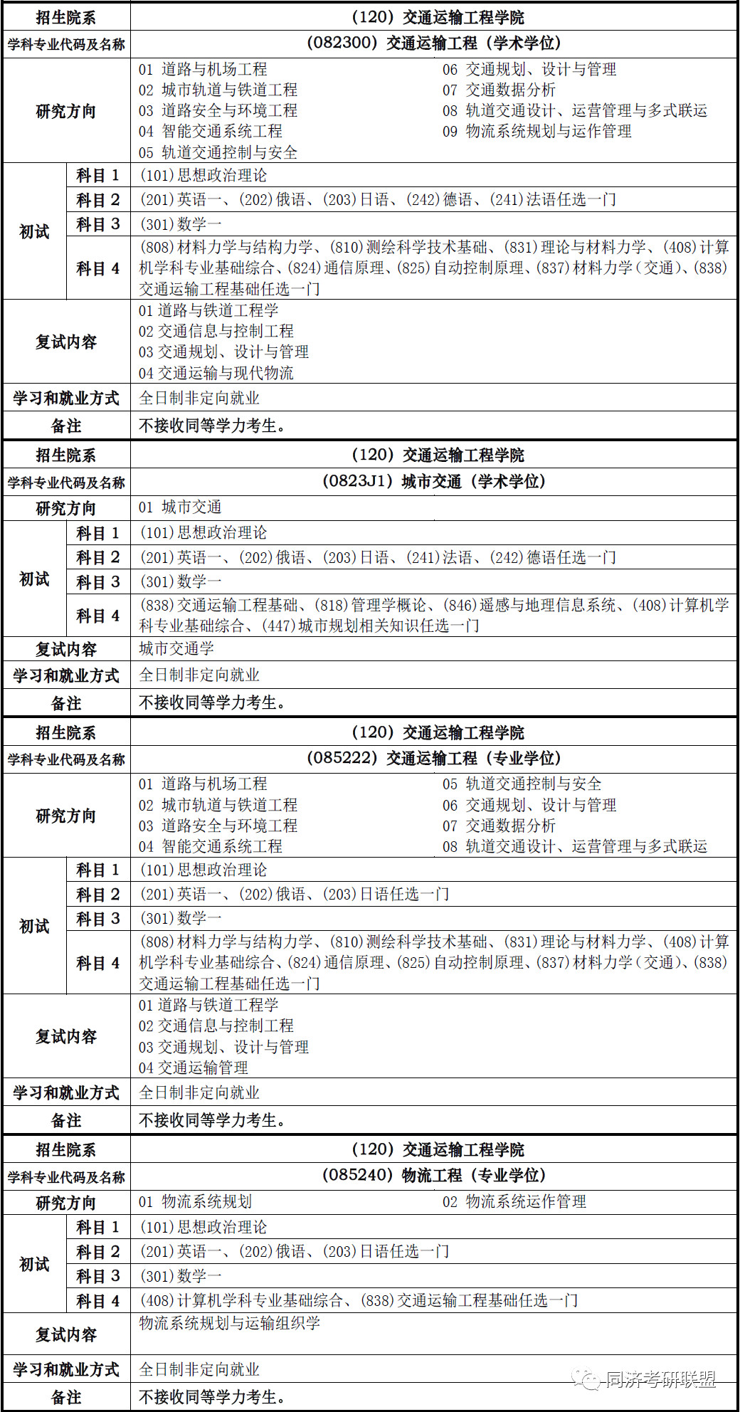 2019年同济大学交通运输工程学院考研招生专业、考试科目