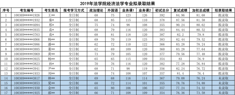 2019年对外经济贸易大学经济法学专业硕士研究生拟录取名单