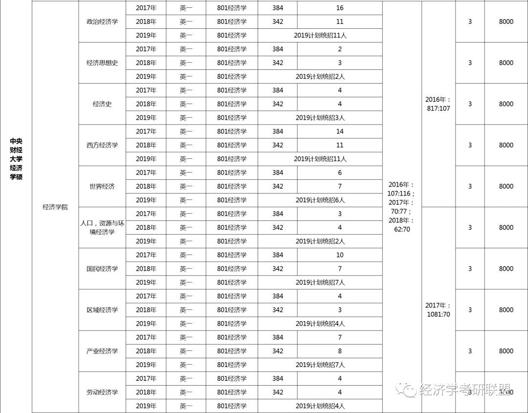 2018年中央财经大学经济学院有国民经济学(13人)、区域经济学(6人)、产业经济学(11人)、劳动经济学(6人)、政治经济学(14人)、经济思想史(3人)、经济史(4人)、西方经济学(20人)、世界经济(9人)、人口、资源与环境经济学(4人)共10个专业计划招生,共计招生人数为90人。可以看到西方经济学专业是招生最多的专业,多达20人,但央财的西方经济学专业也是每年的大热专业,报考人数多,分数线高,竞争大,因此同学们在选择专业时,也要考虑报录比率的问题。